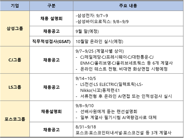 채용 직무나 전형별 일정 등 상세한 내용은 각 그룹사 채용홈페이지에서 채용 공고를 참고하시기 바랍니다.